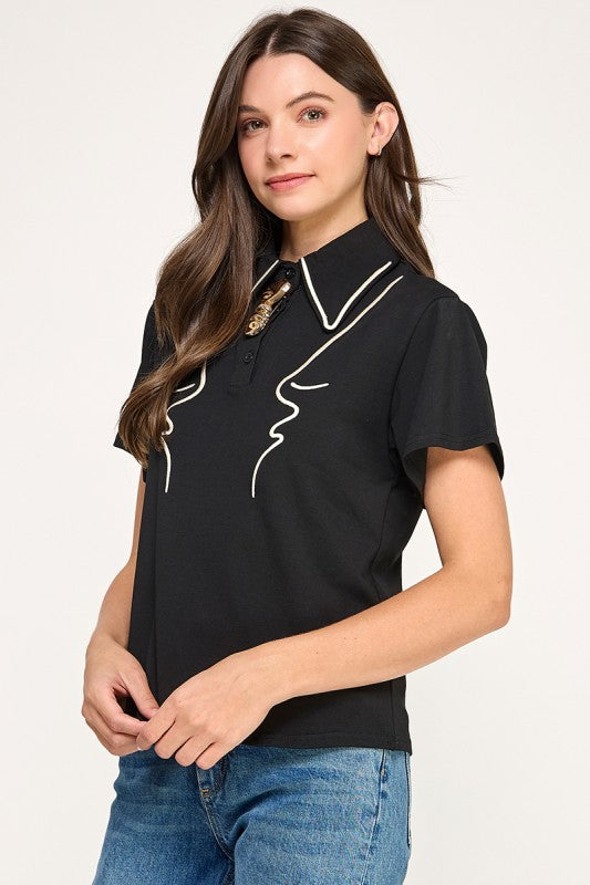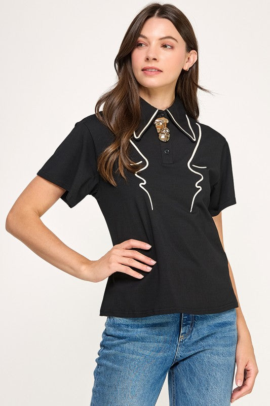 Hermoso de top en negro con detalles en blanco, de cuello alto y detalle de botón dorando en la parte superior.