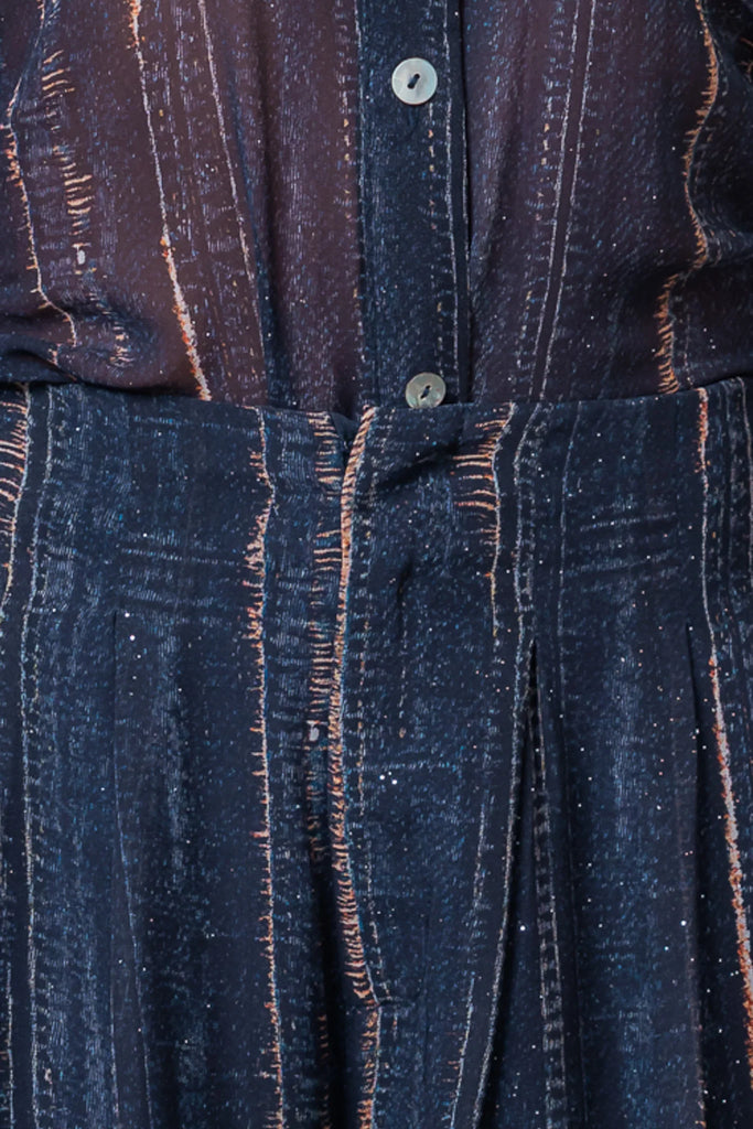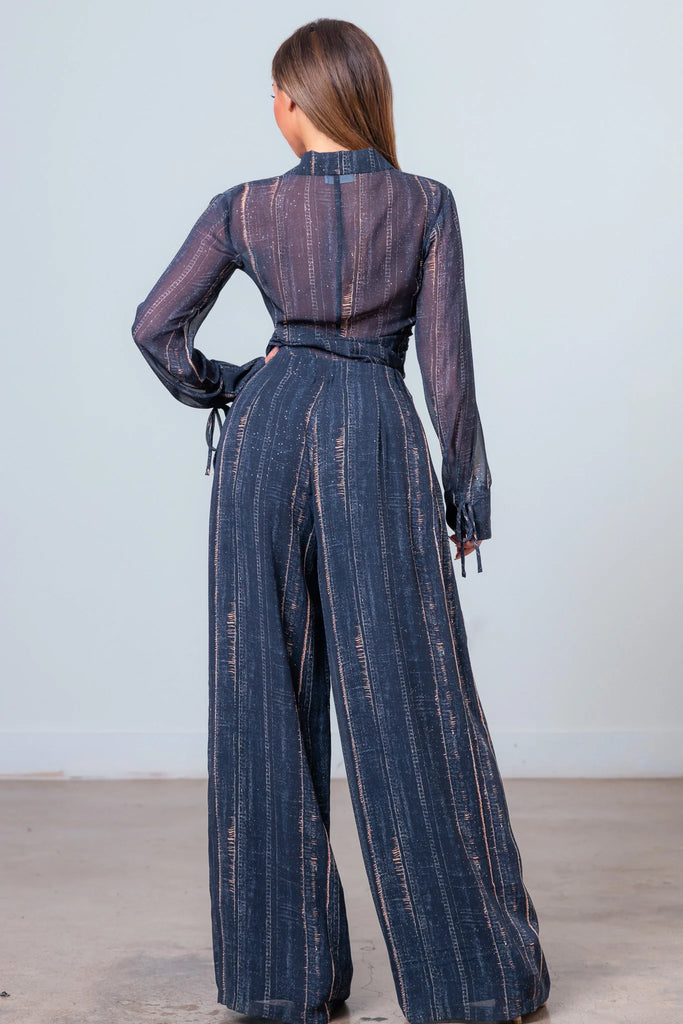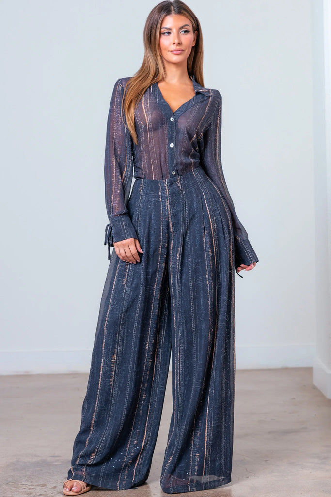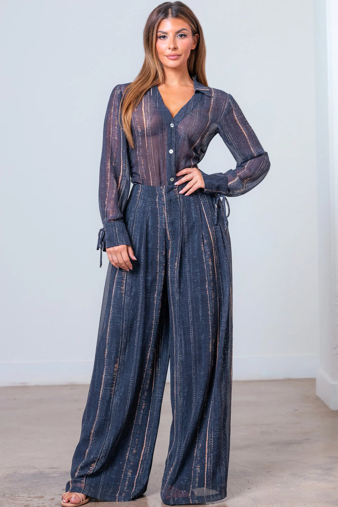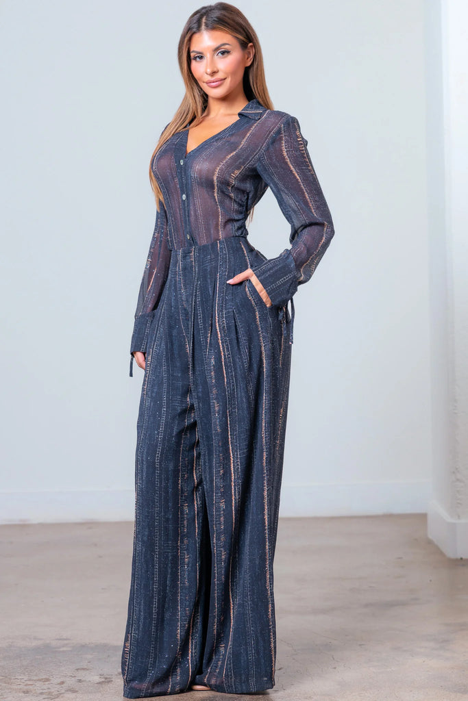 -Detalles: Cintura ceñida, botones, cremallera frontal, pernera ancha, bolsillos laterales, puños, cuello, manga larga.