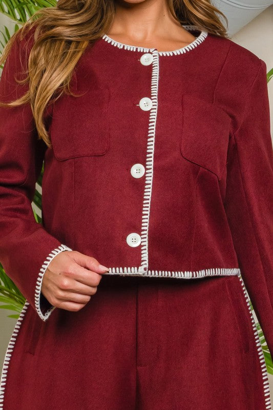 Hermoso y elegante set en en hilo, con elegante corte de pantalón y doble ruedo con costura blanca en la parte lateral tanto del pantalón como la chaqueta. Bolsillos agregados.